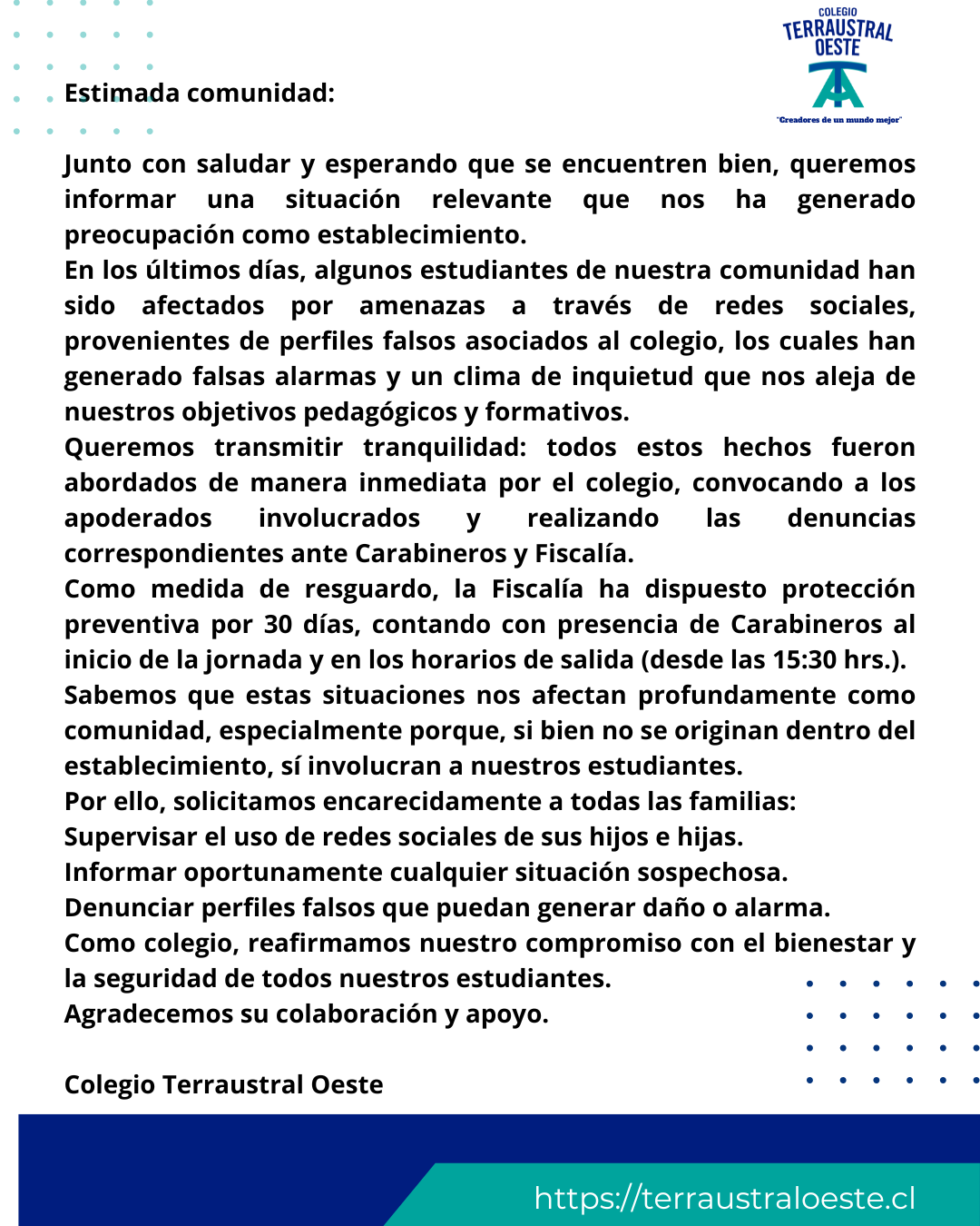 Se recuerda que la atención a apoderados se realizará exclusivamente con cita previa.Por favor, agende su cita enviando correo electrónico y preséntese únicamente en..